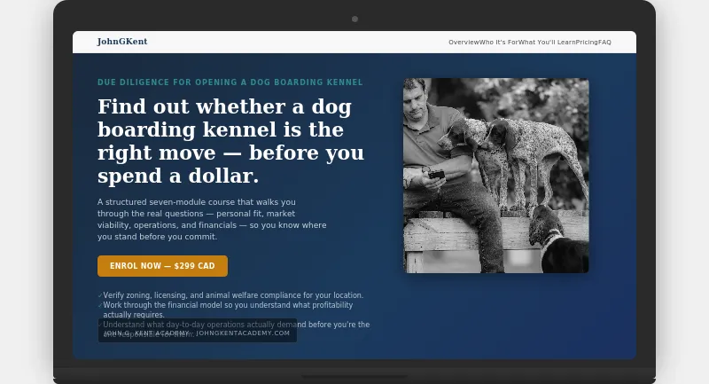 A structured self-reflective course that walks you through the real questions — personal fit, market viability, operations, and financials — so you know where you stand before you commit.